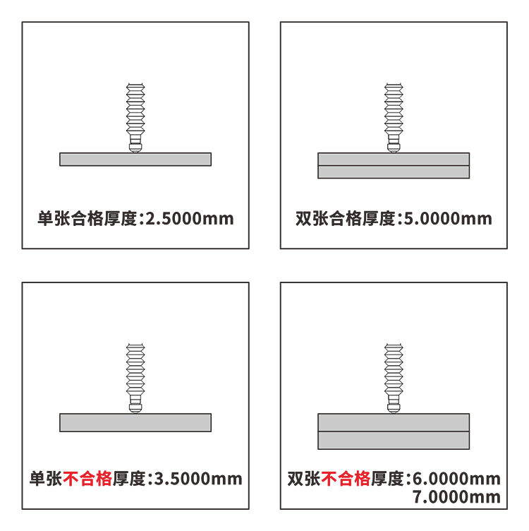 在檢測來料厚度時,合格料的厚度大概為2.5mm,不合格料大概為3.5mm,誤差不超過0.1mm,精度要求不高,而ECOTTER接觸位移傳感器的檢測精度可以達到0.5um,并且支持動態(tài)測量。設定合格尺寸2.5±0.1mm、5.0±0.1mm,不合格尺寸3.5±0.1、6.0±0.1mm、7.0±0.1mm實現(xiàn)剔除。