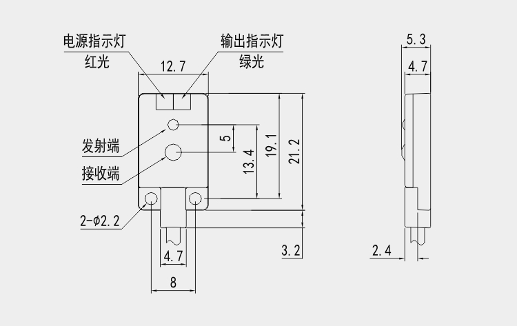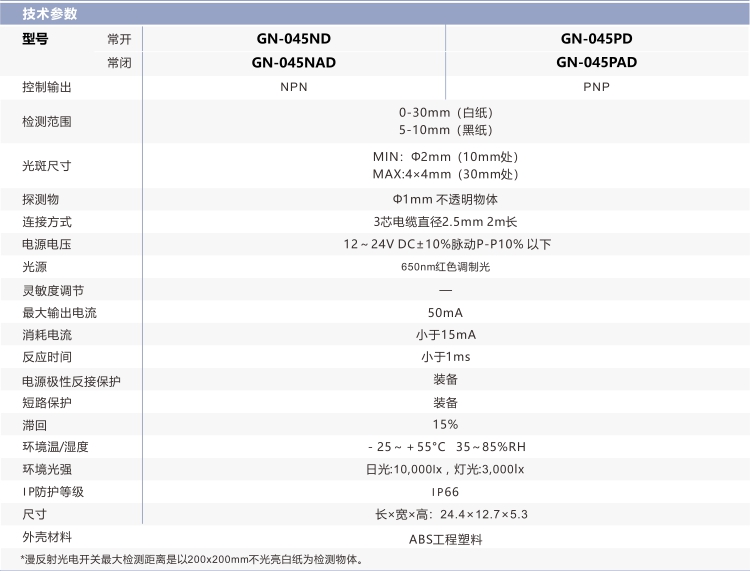 超薄型光電開(kāi)關(guān)GN-045D系列采用小光斑尺寸設(shè)計(jì),檢測(cè)距離達(dá)到30mm,30mm處光斑僅為3*3mm; 配備方便觀察的雙色指示燈一一紅色電源指示燈與綠色輸出指示燈。