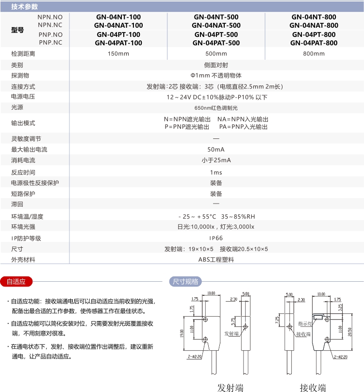 這款超薄光電是小光斑對射型,采用小光斑尺寸設(shè)計,500mm處光斑僅為中30mm,并配備方便觀察的雙色指示燈--紅色電源指示燈與綠色輸出指示燈。