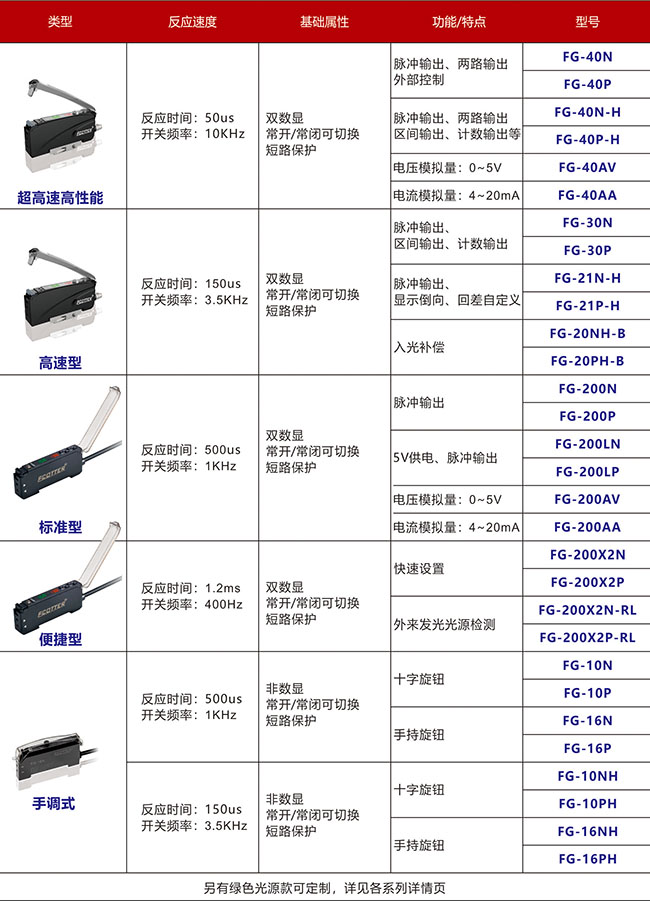 ECOTTER光纖放大器穩(wěn)定性佳,功能種類可選,有超高速高性能款FG-40系列,達(dá)到10Hkz的開關(guān)頻率,支持兩路輸出。高速型達(dá)到3.5KHz,配備了區(qū)間輸出、計數(shù)輸出。標(biāo)準(zhǔn)型開關(guān)頻率1KHz,便捷型400Hz,可最快速設(shè)置閥值,還有手調(diào)式的光纖放大器。