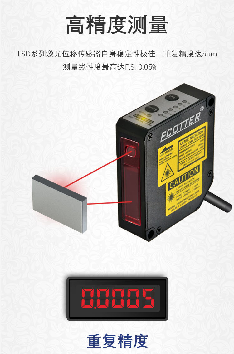 ECOTTER 激光位移傳感器有LSD-30系列量程25~35mm款,重復(fù)精度0.5um,測量精度5um;LSD-50系列量程40~60mm款,重復(fù)精度3um,測量精度20um;LSD-85系列量程65~105mm款,重復(fù)精度5um,測量精度50um;LSD-250系列量程100~400mm款,重復(fù)精度20um,測量精度500um。