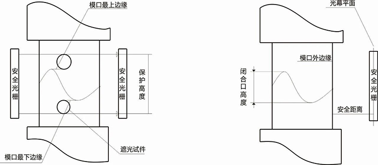 高度設定:光幕高度位置的設定,應使安全光幕的保護高度覆蓋整個閉合???,并在距閉口袋最上邊緣和最下邊緣,各留出至少一個遮光試件直徑值的余量。