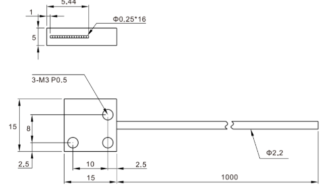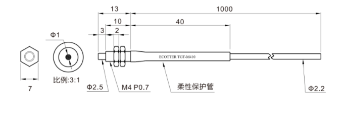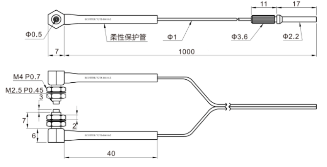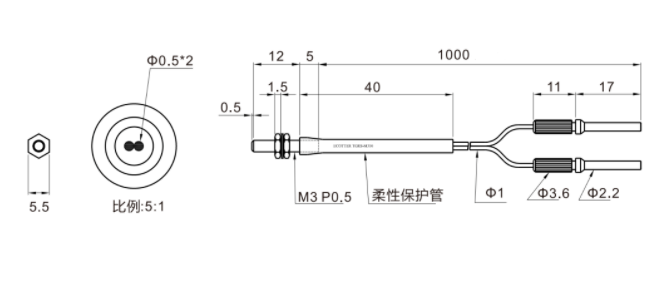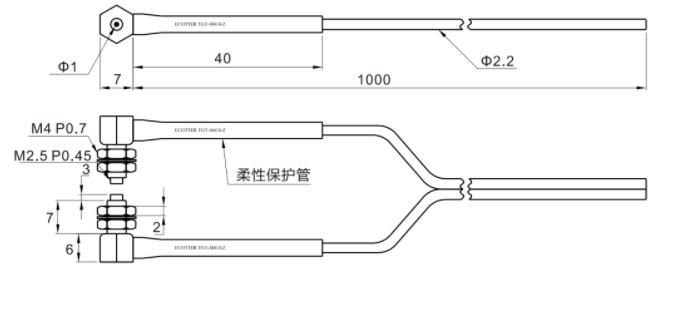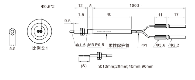 反射細芯光纖(0.5mm/ф1.0),帶螺紋(M3),光纖線長1000mm,凸管長90mm。
